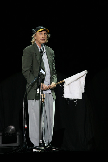 SIEGEN. (wp) "Katzeklo" singt er nicht. Nur die Melodie lässt er einen Takt lang bei "Fly Me To The Moon" anklingen. Helge Schneider stolpert lieber assoziativ von einer absurden Geschichte in die nächste. Mit einer roten Nase im Gesicht und einem schweren Koffer in der Hand betritt Helge Schneider die Bühne der Siegerlandhalle. Dort wartet schon seine Band. Er holt ein winziges Saxophon aus dem Koffer und bläst mit den Kollegen "Cheek To Cheek". Es dauert lange, bis er etwas sagt. Er habe von Marcel Marceau gelernt, wie man pantomimisch eine Heizung oder ein Radio anmacht, sagt er und dreht in der Luft herum. "Ich habe auch eine Schallplatte mit Pantomimen gemacht."