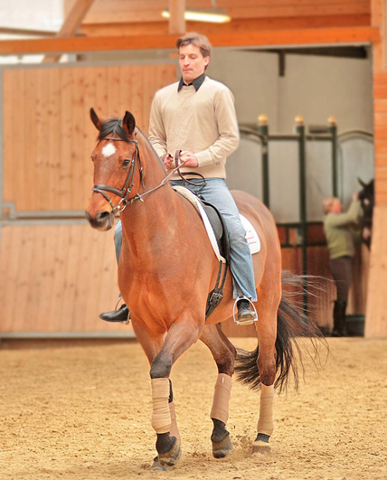 Und er entscheidet sich gegen mich. So als würde ich ein Orchester dirigieren, in dem "Fantast" jedes Instrument gleichzeitig spielen muss. Wenn ich ihm doch nur sagen könnte, was ich will. Aber meine Stimmbänder sind hier Beine, Hände und Körperhaltung, und die haben bisher viel zu selten sprechen müssen. Als ich Jörg Jacobs frage, ob ich mit meinen diffusen Kommandos etwas bei "Fantast" kaputt machen kann, beruhigt er mich: "Die Lektionen sind bei ihm so gefestigt, da passiert so schnell nichts."