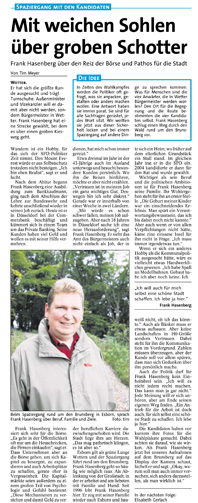 "Mir würde es schon schwer fallen, meinen Job aufzugeben. Aber nach 18 Jahren in Düsseldorf suche ich eine neue Herausforderung", sagt Frank Hasenberg. Er sieht das Amt des Bürgermeisters auch nicht einfach als Job, der in der beruflichen Karriere dazwischengeschoben wird. Die Stadt liege ihm am Herzen. "Das mag pathetisch klingen, es ist aber so."