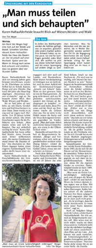 Auch an Aufgaben hänge nicht ihr Leben, erklärt Karen Haltaufderheide. Sie tritt an, weil sie Bürgermeisterin werden will. Aber wenn man sie nicht wählt, mache sie eben etwas anderes. Vielleicht steht sie bei der nächsten Landtagswahl auf einem aussichtsreichen Platz auf der Liste. "Ich könnte mir auch vorstellen, als Entwicklungshelferin irgendwo hinzugehen und alles hinter mir zu lassen." Nur eine Sache stehe immer für sie an erster Stelle: die Familie.