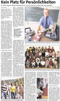 Die Zeit der Persönlichkeiten unter den Lehrern sei heute mehr oder weniger vorbei, meint Werner Mäsing. Heute sei die Arbeit geprägt von einem strammen Lehrplan, zentralen Prüfungen und Lernstandserhebungen. Gemeinschaftliche Aktivitäten, wandern und singen, müssen hinten anstehen. „Dafür bleibt einfach keine Zeit mehr."