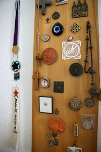 Schwester Magdalena Krol ist als Regina in Sachsen Anhalt geboren. Vor 59 Jahren. An ihre Wände hat sie zwei bemalte Tücher gehängt. Ein bisschen versteckt neben dem Bücherregal steht ein Brett, das mit kleinen Andenken geschmückt ist. Steine, ein Kreuz aus Irland, eine Ikone aus dem 17. Jahrhundert, Ketten, Stickereien. „Ich mag kleine Dinge", sagt Schwester Magdalena. „Vollkommen ist nicht etwas, was üppig ist."