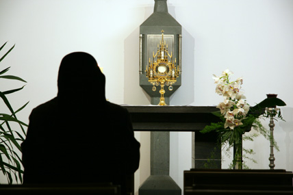 Schwester Magdalena zeigt in der großen Kapelle auf einen Balkon und den dahinterliegenden Raum. Durch die farbigen Fenster scheint Licht. Dort, in der Anbetungskapelle, sitzen von 11 bis 20 Uhr abwechselnd die Schwestern und beten. Die personell möglichen Reste der ewigen Anbetung. In dieser kleinen Kapelle liegt ein Buch, in das die Menschen Gedanken eintragen können. Sie bitten um Gesundheit für ihr Kind oder dass die Tochter ihr Abitur schafft. Auf den letzten Seiten stehen Eintragungen zu den Naturkatastrophen in China und Birma. Schwester Magdalena selbst hat auch etwas im Buch hinterlassen, als ihr Vater krank wurde. Die Anbetung habe nichts Magisches oder Mechanisches. „Gott ist kein Automat, in den ich meine Gebete stecke", sagt sie. „Er lässt sich nicht bestechen." Es gehe darum, eine Situation zu bestehen.