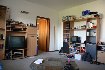 Im Raum neben der Küche liegt sein Wohnzimmer. Ein Ecksofa, ein Regal mit Büchern, eines mit DVDs, Fernseher, Schreibtisch und Computer. Aus den Minilautsprechern neben dem Monitor kommt rauschender Wind. Die Heldin aus dem Spiel Resident Evil steht gerade an einer Kluft. Marc Klemrath hat auf Pause gestellt. An dem flachen Tischchen in der Mitte des Raumes isst er meistens. Am Küchentisch hat er bisher nur einmal gefrühstückt. Er benutzt ihn heute nur noch, um Waffeln oder Kuchen nach den Rezepten seiner Mutter zu backen.